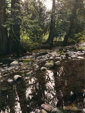 Sunrays were glittering on the flowing water, causing dancing shadows from the low hanging leaves nearby on its surface. Stones in the bed of the river generated little swirls accompanied by a soothing, gurgling sound.