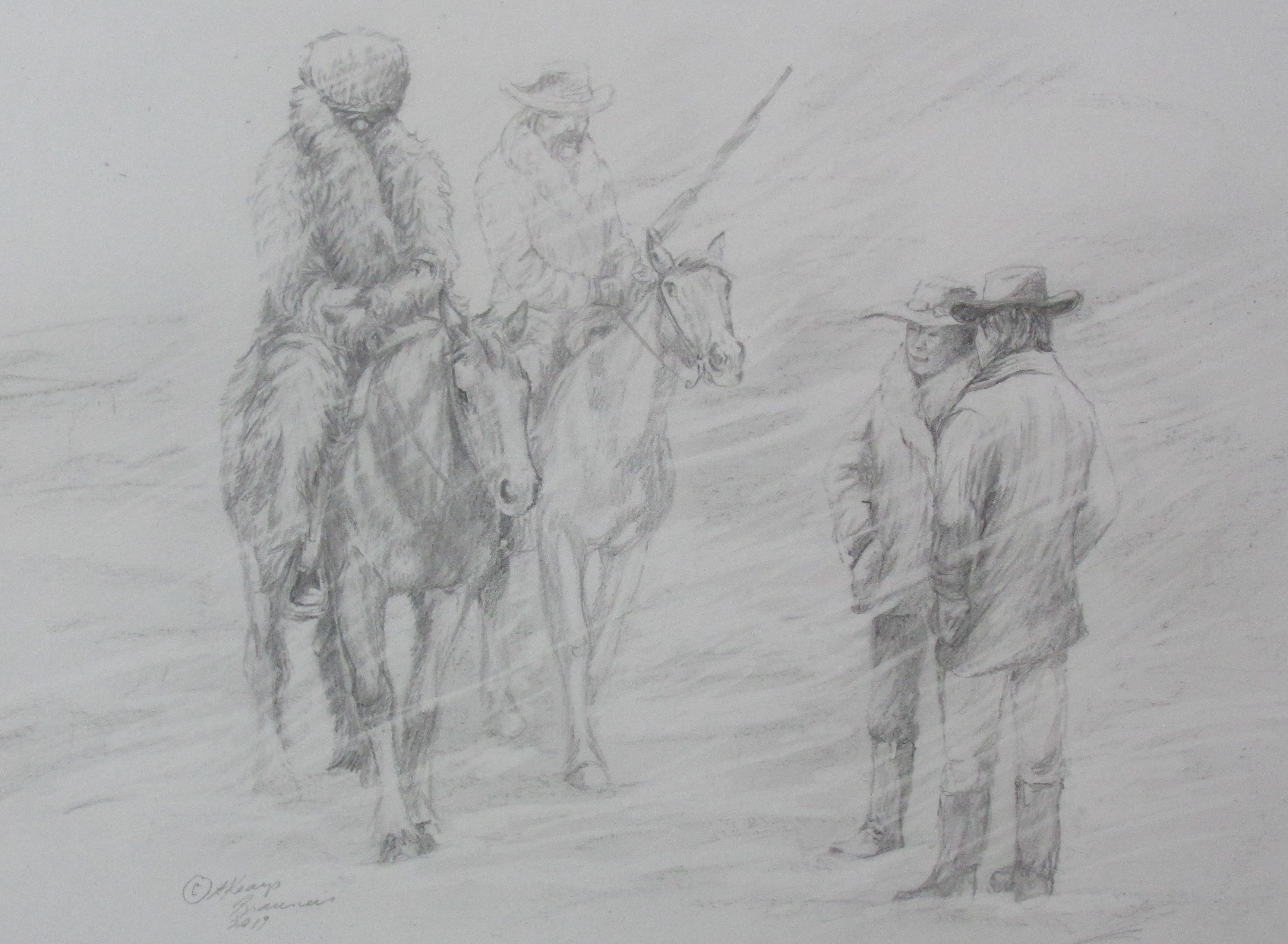 Charlie shrugged, as he dismounted. “I donno.” He stamped his feet and blew into his hands. “We spied ‘im wanderin’ around out there by Bull Frog Creek. He says he got lost.”
