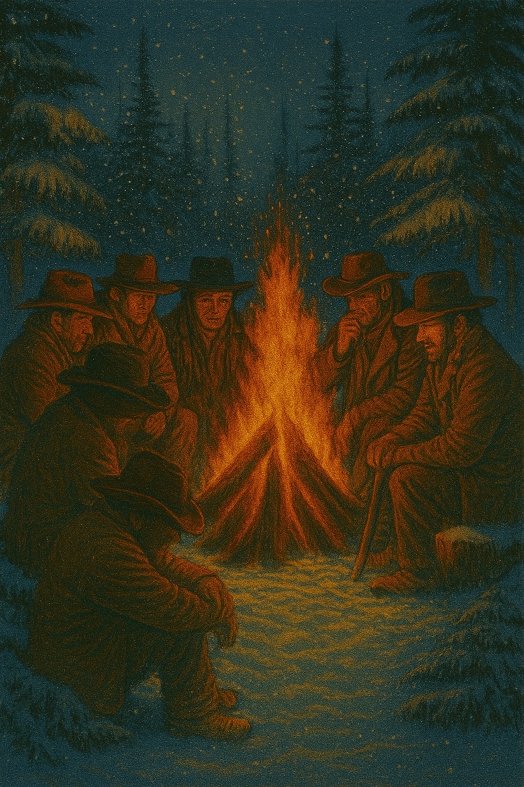They settled into a circle about a banked, sparking fire—Kid leaned against his saddle, Wheat and Kyle sharing a log, Hank, Lobo, and Monty on another, a lone stump left for Preacher.